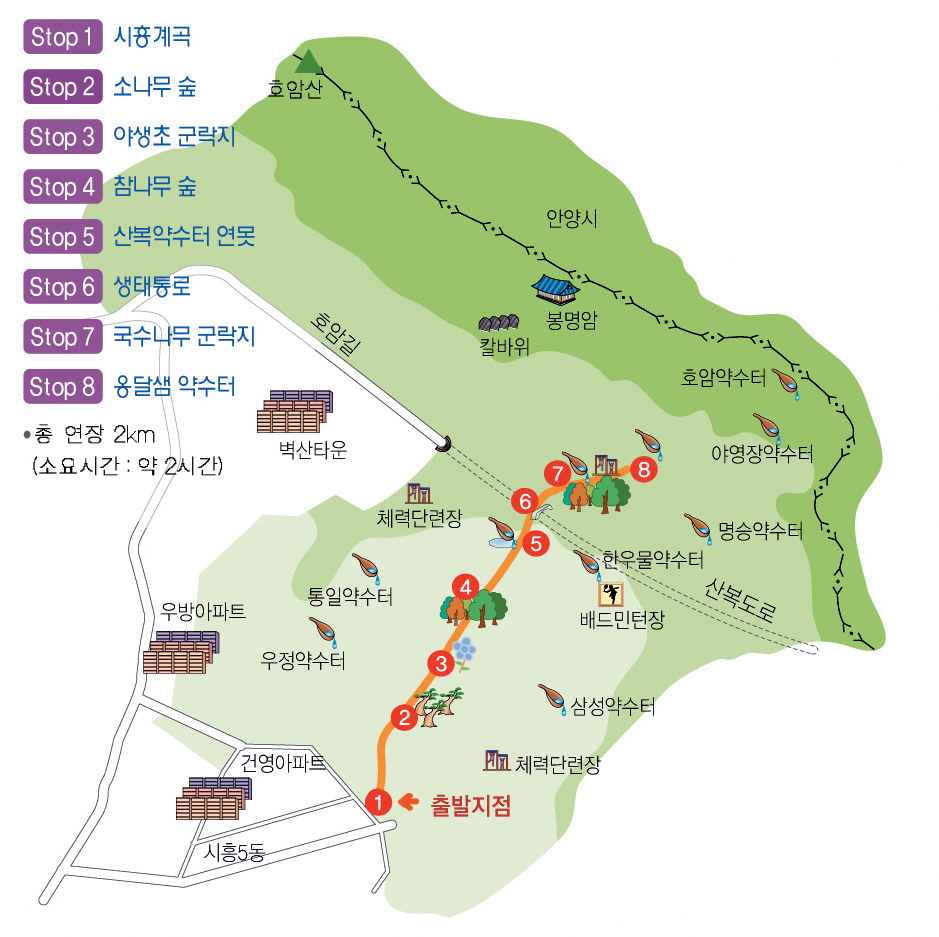 탐방은 시흥 5동 시흥계곡 입구 녹지관리초소 앞에서 시작돼 옹달샘 약수터에서 끝난다. 전문 숲 해설가가 산의 역사와 문화 및 자연생태를 설명하며, 확대경과 청진기를 이용해 수목을 관찰할 수 있다. 프로그램은 2·4주 일요일 오전 10시 운영하며, 탐방코스는 총 연장 2㎞로 2시간 정도 소요된다.50∼60명 선착순 모집한다.7월 넷째주는 ‘물속곤충 관찰’,8월 둘째주는 ‘숲속의 청소부’,8월 넷째주는 ‘숲속의 토양’ 등을 중심으로 프로그램을 운영한다.