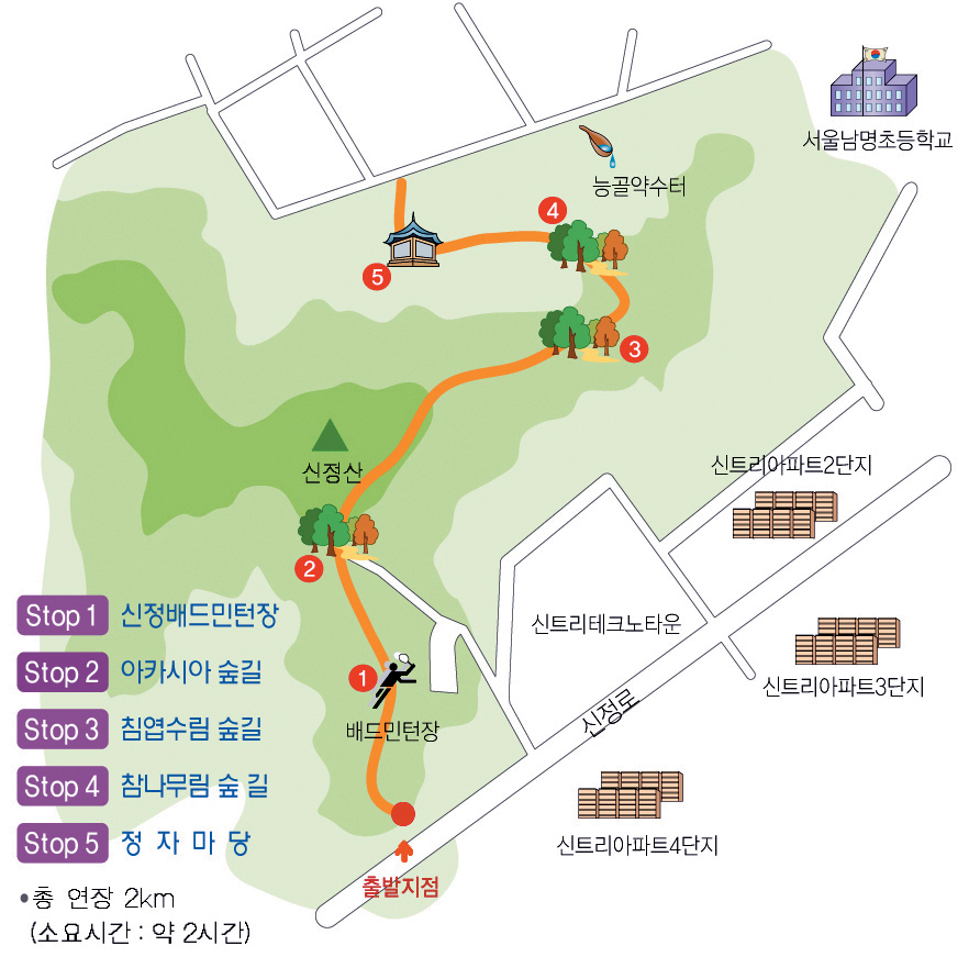 양천구 신정동 신정배드민턴장에서 시작된다. 여기에서 아카시아 숲길과 침엽수림 숲길, 참나무숲길, 정자마당으로 내려온다.