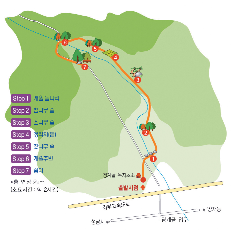 탐방은 청계산 등산코스 중 한 곳인 서초구 원지동 청계골 입구에서 시작된다. 개울돌다리에서 청계산의 역사와 문화를 배운 뒤 참나무숲과 소나무숲을 거치면서 숲의 천이과정 등을 관찰한다.