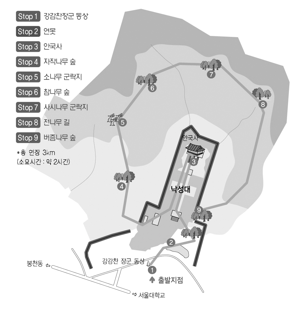 관악구 봉천동 낙성대공원에서 시작해 안국사 주변 숲을 도는 것으로 이뤄졌다. 강감찬동상 앞에서 관악산과 낙성대의 유래, 강감찬 장군 이야기를 들으며 재미있게 출발한다. 이어 연못에 이르러 수생식물을 관찰하고, 안국사에서 경내의 예절을 배운다. 소나무군락지와 참나무, 사시나무, 전나무, 버즘나무 이야기를 들을 수 있다. 코스는 총 연장 3㎞로 2시간 정도 소요된다.