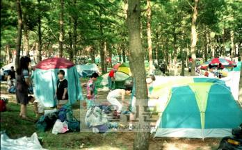 그러나 반가운 소식도 있다. 자연 친화적인 바캉스 문화가 싹트면서 동호인을 중심으로 텐트 야영객이 늘어나고 있는 것. 동호인들은 100∼200명 단위로 야외에 텐트를 치고 바비큐 그릴과 솥 등 취사 도구를 내걸고 3∼4일씩 캠핑을 한다. 텐트업계는 주 5일제가 확산되면서 이 같은 텐트를 이용한 야영객 증가에 실낱 같은 기대를 걸고 있다.