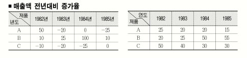 (1) 1982년의 경우 매출액이 가장 높은 것은 C제품이다.