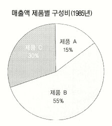 (4) 1984년 A제품의 구성비는 20%이고,1985년은 15%이므로 틀리다.