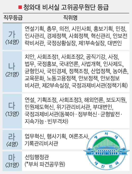 26일 본보가 입수한 청와대 비서실의 직무등급자료에 따르면 청와대는 옛 직급이 1∼3급인 83개 직위를 일반 부처와 같이 ‘가∼마’까지 5등급으로 분류했다.83개 직위는 13개 실장·수석·보좌관을 뺀 52개 비서관과 31개의 부처 파견 공무원 자리를 대상으로 삼고 있다.