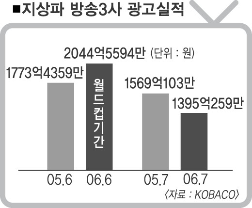 방송계 관계자는 “월드컵 중계방송과 관련된 수주액은 전체 광고물량의 80%를 웃돌았지만 7월 들어 현저히 줄어든 상황”이라면서 “하반기 경기 침체가 지속될 것으로 예상돼 기업들이 광고를 줄이는 등 지상파 광고시장은 더욱 얼어붙을 것”이라고 전망했다.