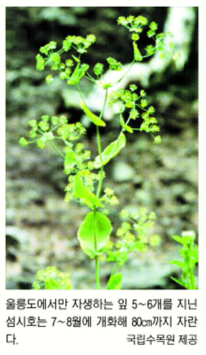 산형과의 다년생 식물인 섬시호는 1916년 세계에서 유일하게 울릉도에서만 발견된 희귀식물이다. 잎이 5∼6개로 7∼8월에 개화, 최고 80㎝까지 자라고 주로 해안가 산중턱 등에 자생한다.