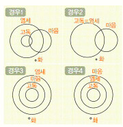 화를 자주 내는 사람은 마음이 즐거운 사람과는 교집합이 없지만, 평소에 고독을 즐기는 사람과 염세주의자와는 교집합의 유무를 확실하게 단정할 수 없다.