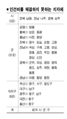 지난해의 141곳에서 10곳이나 늘어났다. 세외수입까지 포함해 자체수입 전체를 합쳐도 42곳이 직원들의 봉급도 못 주고 있다. 행자부는 “세제를 개편하고 성과주의를 도입하는 등 다양한 방법으로 지방재정이 늘어날 수 있도록 노력하고 있다.”면서 “지방도 자율성 증대와 함께 효율성·투명성·책임성을 강화하기 위해 힘써야 할 것”이라고 말했다.