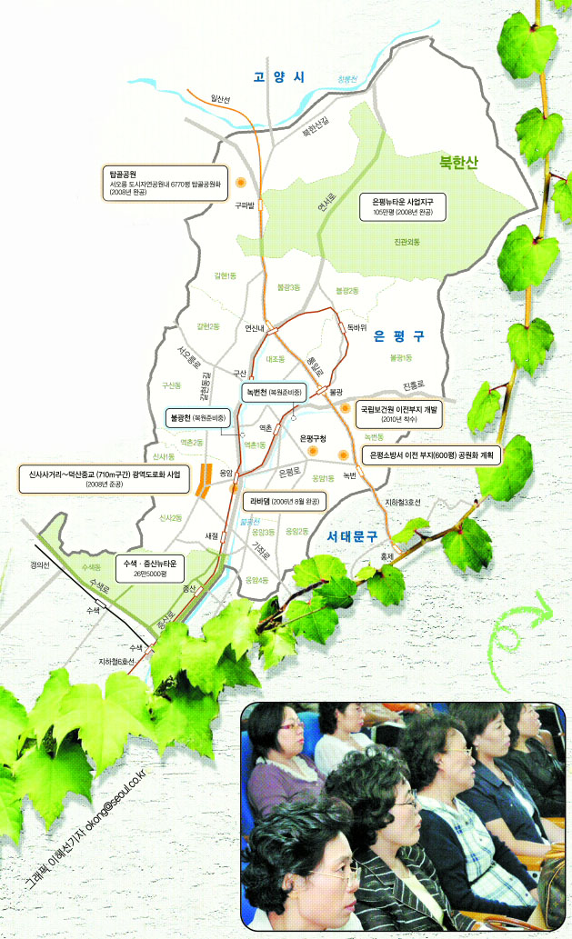 은평구는 인구 증가로 인한 교통 혼잡에 대비,250억원을 들여 고양시와 연결되는 신사사거리∼덕산중학교 사이 710m 구간에 폭 25m의 광역도로 개설사업을 추진하고 있다. 3차 뉴타운 지역으로 지정된 수색·증산 지구는 자력 재개발 방식으로 추진된다. 이곳은 마포구 상암지구와 인접, 상암 DMC의 배후 주거기능을 중심으로 서북 지역의 핵심 주거축으로 거듭날 것으로 보인다. 노 구청장은 “수색변전소 부지에는 공원을 건립하고, 인접지역은 특별계획구역으로 지정해 업무·주상복합시설이 들어설 수 있도록 할 계획”이라고 설명했다.