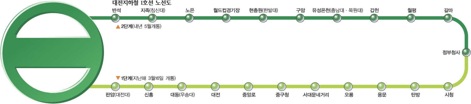 대전지하철 1호선이 내년 5월 완전 개통된다. 대전도시철도공사는 1호선 2단계 정부대전청사∼반석역(10.2㎞) 구간이 내년 5월 개통된다고 8일 밝혔다.1단계 구간인 판암역∼정부대전청사간 12.4㎞는 지난해 3월 개통됐다. 2단계는 전 역사에 스크린도어, 장애우를 위한 엘리베이터와 음향유도기, 휠체어 전용출입구는 물론 1단계 구간에 없는 수유실 등이 화장실에 설치된다. 현재 1단계 구간 하루 이용객은 3만 5000명 선으로 2단계가 개통되면 유성과 노은지역 주민들을 끌어들여 6만∼7만명으로 늘어날 전망이다.