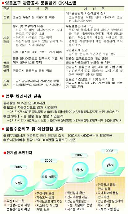 계획·설계·계약·시공·준공·사후관리 등 전반적인 건설공사 사항을 관리하는 ‘관급공사 품질관리 OK 시스템’ 개발에 돌입했다. 관급공사의 부실을 제도적으로 예방하기 위해서다. 지난 4월24일부터 9월30일까지 1억 600만원을 들여 1단계 개발을 완료, 공사장 5곳에 시범 적용하고 있다.