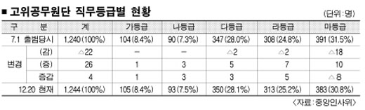 현재까지 80개 직위에 대해 개방형과 공모로 충원하기로 했는데, 이 중 38개 직위만 임용이 된 상태다.22개 직위는 신원조회 중이고,20개 직위는 현재 공고 중이다. 출범 당시 1240개이던 고위공무원단 직위는 이날 현재 1244개로 조정됐다.
