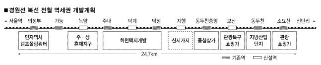 의정부∼동두천간 복선전철 구간은 22.3㎞. 단선구간인 동두천∼소요산 2.4㎞를 포함해 24.7㎞로 11개 역이 있다. 경유지 자치단체별로 도시기본계획과 지구단위계획을 성안하거나 대규모 택지개발계획에 포함시켜 앞다퉈 역세권 개발에 나서고 있다.