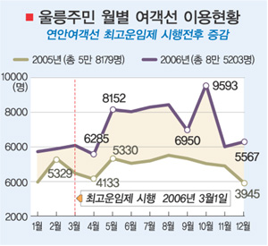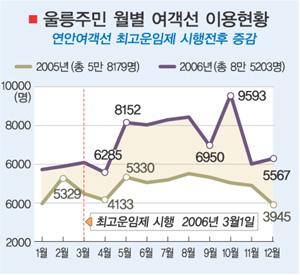 울릉도 도동항 인근에서 슈퍼마켓을 운영하는 한 주민은 “뱃삯이 싸진 이후부터 주민들의 육지 출입이 잦아지면서 소비가 주로 육지에서 이뤄지고 있다.”면서 “울릉도 가게들은 파리만 날리고 있다.”고 하소연했다.