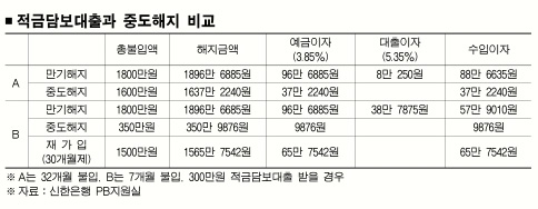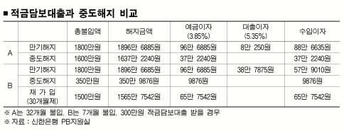 A씨는 300만원의 대출에 대해 4개월간 5.35%(3.85%+1.5%)의 금리가 적용돼 8만원만 이자로 내기 때문에 중도해지 때보다 51만원 이상의 이익이 발생한다. 만기가 오래 남은 B씨는 대출이자가 38만원 이상이고, 수입이자는 그 만큼 줄어들기 때문에 일단 중도해지한 뒤 다시 적금에 가입하는 것이 유리하다.