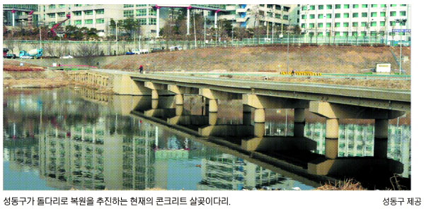 서울 성동구가 금가고, 아스팔트와 콘크리트로 덧씌워져 넝마가 된 ‘살곶이다리’ 복원에 나섰다.