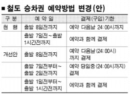 개선안에 따르면 우선 KTX 역방향 좌석을 공사측이 일방적으로 지정하는 규정을 백지화했다. 고객이 예약할 때 좌석을 선택할 수 있는 권한을 다시 부여한 것이다. 출발 7일 이전과 이후 2단계인 승차권 예약 및 결제를 3단계로 세분화했다.