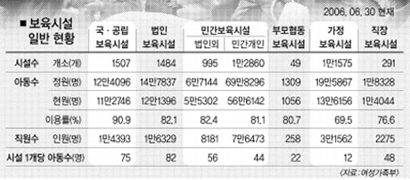 그러나 정부의 지원을 받는 국·공립, 법인 보육시설은 각각 전체의 5.2%씩밖에 안 된다. 민간과 가정보육시설이 전체의 88.2%에 이른다.