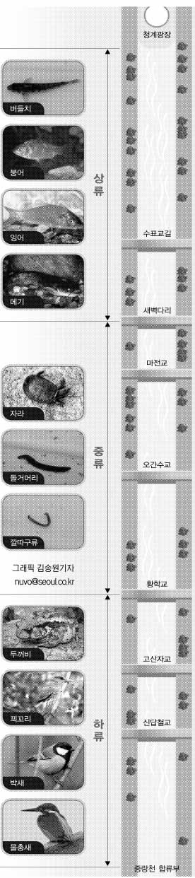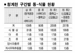 조사결과 청계천에서 가장 생명력이 넘치는 곳은 하류(황학교∼중랑천 합류부)다. 특히 신답철교에서 중랑천이 합류하는 2㎞ 구간은 식물 199종, 어류 10종, 조류 27종, 양서파충류 8종 등 모두 257종이 서식하고 있는 것으로 조사됐다. 특히 하류에서는 환경부 멸종위기 2급보호종인 꾀꼬리와 물총새, 박새는 물론 두꺼비도 발견됐다. 토종 긴몰개와 가시납지리 등 토종 어류도 관찰할 수 있다.