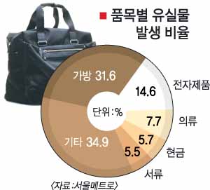 이어 휴대전화나 MP3 플레이어 등 전자제품 7535건(14.6%), 의류 3982건(7.7%) 등이 뒤를 이었다. 가방이나 지갑 등에 든 현금도 2931건(5.7%),2억 5000여만원이나 됐다. 유실물은 서울메트로 홈페이지(www.seoulmetro.co.kr), 서울시도시철도공사 홈페이지(www.smrt.co.kr), 유실물 종합정보서비스(www.lost114.com)에서 화상정보를 이용해 확인할 수 있다. 유실물을 찾기 위해서는 시청역(1·2호선,753-2408∼9)과 충무로역(3·4호선,2271-1170∼1 ), 왕십리역(5·8호선,6311-6765), 태릉입구역(6·7호선,6311-6766) 유실물 센터를 방문해야 한다.