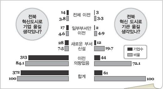 이밖에도 7.5% 28개 기관·기업은 기존 조직을 유지한 채 혁신도시에 새로운 부서를 신설하겠다고 밝혔고 회사 내 일부 부서만 이전하겠다고 답한 기업은 4.6% 17곳이었다. 전북발전연구원이 한국토지공사, 대한지적공사, 농진청 산하기관 등 61개 유관기관을 대상으로 실시한 설문조사에서도 72.1% 61곳이 이전의향이 없다고 응답했다.‘회사 전체를 전북 혁신도시로 이전하겠다.’는 기관은 농진청 산하기관 2곳뿐이었다. 나머지 기관들은 ‘새로운 부서를 신설하거나 일부 부서만 이전하겠다.’고 답했다.