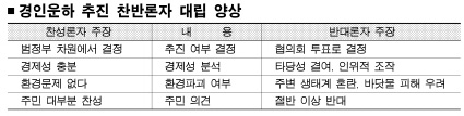갈등은 1995년 정부가 경인운하를 민자사업으로 선정하면서 시작됐다. 갈등을 풀기 위해 2005년 운하건설 찬성·반대론자들이 ‘굴포천유역 지속가능발전협의회’(위원장외 각각 6명 균등 추천)를 구성하기에 이르렀다. 이때까지만 해도 갈등 해결의 실마리가 보이는가 싶었다. 그러나 3년 동안 15차례 머리를 맞댔지만 합의는커녕 오히려 갈등만 키웠다는 지적을 받고 있다.16일 회의가 열리지만 갈등의 골이 워낙 깊어져 합의를 이끌어내지 못할 것으로 보인다.
