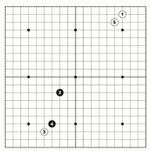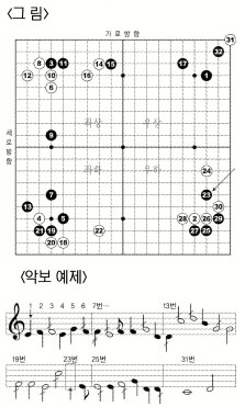 2) 각 음표 줄기의 위치와 방향은 바둑돌이 바둑판의 ‘좌상, 좌하, 우상, 우하’ 가운데 어디에 위치하느냐에 따라 결정된다.