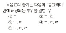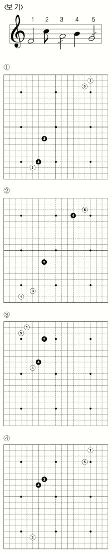 문 2. (보기)의 악보를 바둑판에 두어 보았다. 그런데 실수로 두 알을 잘못된 자리에 놓았다. 이에 해당되는 바둑판을 다음에서 고르면?