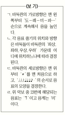 1) 바둑판의 가로방향으로 좌, 우의 끝으로부터 가운데를 향하여 도-레-미-파…순으로 계속해서 음을 높인다.
