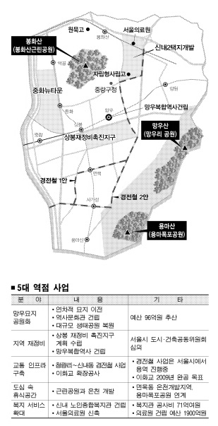 이제 남은 문제는 행정·예산상의 지원이다. 망우묘지 공원화사업에 투입될 96억원의 대부분을 시에서 지원받아야 한다. 또 상봉재정비촉진지구와 상봉터미널 이전 사업은 각각 서울시 도시·건축공동위원회와 건설교통부 중앙도시계획위원회의 심의 과정이 남아 있다.
