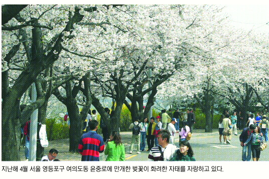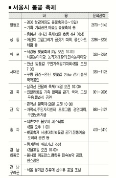 30일 변덕스러운 날씨에도 꽃망울을 터뜨린 봄꽃처럼 서울 곳곳에서 봄꽃축제가 펑펑 터진다. 벚꽃과 진달래, 개나리 등이 만발한 산, 공원에서 펼쳐지는 다양한 4월의 축제들을 소개한다.영등포구는 6∼10일 여의서로, 서강대교 남단 특설무대 등을 중심으로 ‘2007 한강 여의도 봄꽃축제’를 연다. 여의도에 왕벚나무 1641그루를 비롯해 진달래, 개나리, 철쭉 등 8만 7859그루의 봄꽃이 활짝 피는 기간이다.2∼11일 여의서로 일대의 교통이 통제된다.