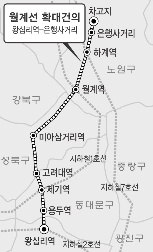 왕십리에서 경동시장∼고려대역∼미아사거리∼장위∼월계동을 거쳐 노원구 은행사거리에 이르는 13.2㎞ 구간의 이 노선은 서울시가 최근 발표한 ‘10개년 도시철도 기본계획’ 10개 후보노선에 포함돼 있다. 건설예산은 총 1조 1285억원으로 추산된다.