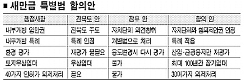 이날 회의에서 전북도는 그동안 주장해온 새만금지구내 토지 무상양여와 경제자유구역 지정에 따른 추가특례 인정 등은 정부측에 양보한 대신 내부 개발 기본 구상에 전북도의 참여 보장과 공유수면 매립면허 특례, 토지 장기임대 등의 요구조건을 이끌어 냈다.