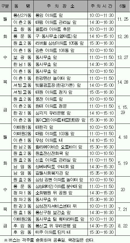 30일 오전 10시 서울 용산구 이촌1동 강촌아파트 106동 앞. 가슴에 책을 한아름 안은 사람들이 옹기종기 모여 있다. 그 사이를 하늘색 낡은 버스가 덜컹거리며 파고 든다. 책읽는 버스, 용산구 새마을 이동도서관이 도착했다.용산구는 서울에서 유일하게 이동도서관을 운영한다.1986년 5월에 시작해 21년간 지역 구석구석을 돌며 책을 빌려 주고 있다. 등록 이용자는 1만 1500명. 버스는 이촌·효창·이태원동 등 33곳을 격주로 방문한다. 이촌1동 강촌아파트에는 수요일 오전 10시에 닻을 내린다.