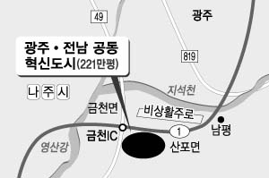 1일 광주시 및 전남도에 따르면 공동혁신도시는 1조 6278억원을 투입, 나주시 금천면과 산포면 729만㎡(221만평)에 2만가구,5만명이 사는 자족형 도시로 2012년까지 조성된다.