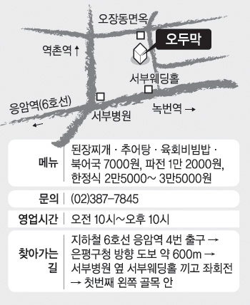 마당에 들어서자마자 구수한 장 냄새가 코끝에 감긴다. 마당 장독대에 있는 10여개의 커다란 장독에서 된장, 간장, 고추장이 익어가는 냄새다. 메주를 쑤는 그을린 아궁이는 정겨움을 더한다. 노재동 은평구청장이 추천하는 응암동의 토속한식집 ‘오두막’의 풍경이다.주인이 직접 담그는 장맛이 뛰어나 노 구청장이 ‘된장찌개’하면 가장 먼저 머리에 떠올린다는 집이다.1980년대 초반에 문을 연 뒤 꾸준히 장맛을 지켜와 구청과 구의회 사람들이 단골로 손꼽는 곳이기도 하다.