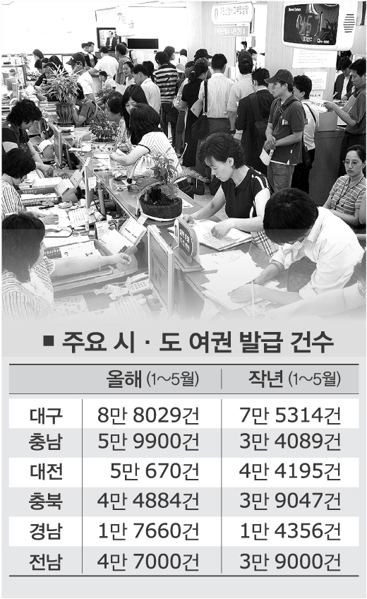 대구의 경우 여권 발급 신청이 사상 최대를 기록했다. 지난 18일 하루 신규 여권 발급신청은 1300여건으로 대구시가 여권 발급 업무를 개시한 1983년 4월 이래 가장 많았다.