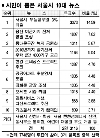 1위에 오른 ‘무능 공무원 퇴출’은 올해 초부터 서울시가 강도 높게 추진한 인사 쇄신책으로, 전체 2만 3116표 중 14.59%인 3373표를 얻었다.