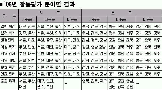 행정자치부는 27일 14개 부처 46개 분야의 시책에 대해 외부평가단에서 평가한 분야별 평가결과를 가·나·다 등급으로 분류해 공개했다. 가 등급을 받은 자치단체에는 재정 및 인사 인센티브를 부여한다.