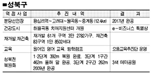 서찬교 성북구청장은 분당선과 연계되는 경전철 ‘동북선’유치를 최대 성과로 꼽았다. 그는 “교통취약 지역인 서울 동북권이 강남·분당과 직접 연결돼 강남북 균형발전이 가능해졌다.”고 평가했다.서 구청장은 지난해 7월 서울시에 ‘분당선 연장안’을 처음 건의했다. 서울 왕십리역에서 경기도 수원을 연결하는 광역전철망인 분당선을 성북구를 거쳐 노원구까지 연장해 달라는 주문이었다.