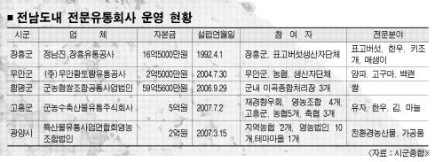 연말까지 보성·영암·신안군이 유통전문회사를 세운다. 또 해남군은 농업인과 출향인사를 연결하는 유통조직을 준비 중이다. 전자상거래 전문회사인 ㈜맛젤(매출액 130억원)과 연결, 출향 향우 5만명과 생산자간 1대1 마케팅 체제를 만든다는 것.