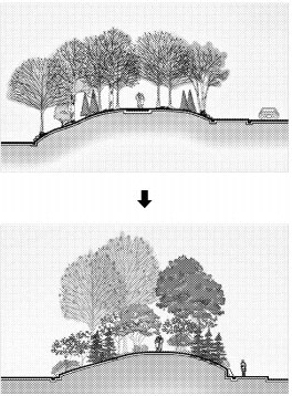 해당지역은 길이 1.3㎞ 면적 3만678㎡의 시설녹지로 플라타너스, 이태리포플러 등 빠르게 자라는 대형 나무들만 울창했던 곳이다. 서울시는 7일 “조성당시 키 크고 빠르게 자라는 나무들만 심고 관리를 하지 않아 나무 아래 식물들은 거의 전멸한 황폐한 환경이 조성됐다.”면서 “이 때문에 생태적 기능은 물론 방음과 차폐기능 역시 기대할 수 없었다.”고 말했다. 새롭게 조성된 생태숲은 기존의 이태리포플러 등 500그루를 베고, 회화나무 등 큰나무 1624그루와 조팝나무 등 작은나무 2만 9090그루, 지피초화류 5만 9000포기를 섞어 심었다. 또 산책로 주변도 계절별로 꽃을 볼 수 있는 작은 나무들을 심었다.