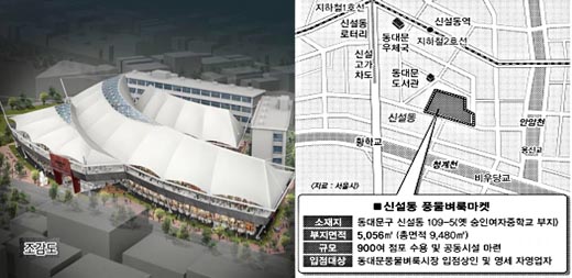 시는 동대문운동장 내 풍물벼룩시장을 철거하는 대신 내년 3월까지 시유지인 동대문구 신설동 109의 5 옛 숭인여중 부지 5056㎡에 새로 풍물벼룩마켓을 조성해 풍물시장 노점 894개를 입주시키기로 했다.