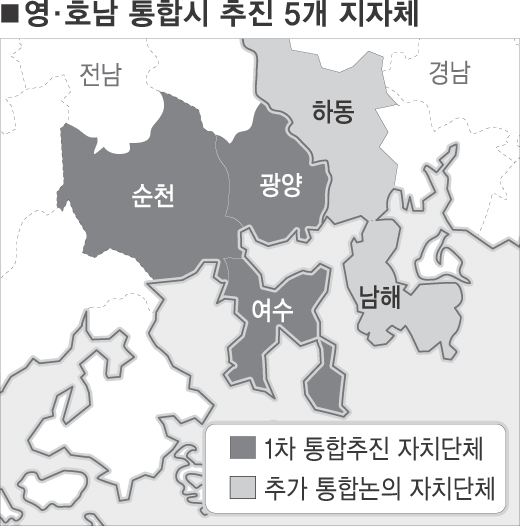 전남 동부권 3개시가 통합되면 여수 29만 8825명, 순천 27만 1164명, 광양 13만 8040명 등 70만 8029명이라는 탄탄한 도시가 탄생하게 된다. 장기적으로 남해군과 하동군과도 통합여부를 논의 하기로 했다.