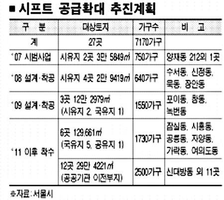 또 내년에는 2010년 공급을 목표로 강남구 수서동 737(230가구), 양천구 신정동 324의 11(180가구), 중랑구 묵동7(90가구), 동대문구 장안동 284의 5(140가구) 등 시유지 4곳에 640가구의 건설을 시작한다.