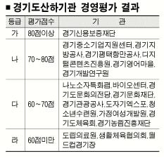 이 가운데 신용보증재단이 유일하게 최고 등급인 가(80점 이상) 등급을 받았으며, 경기중소기업지원센터 등 6곳은 나(70∼80점) 등급을 받았다. 그러나 나노소자특화팹 등 10곳은 다(60∼70점) 등급, 경기도립의료원 등 3곳은 최하위 등급인 라(60점 미만) 등급을 받는 등 절반 이상이 70점 이하의 성적을 거둔 것으로 나타났다.