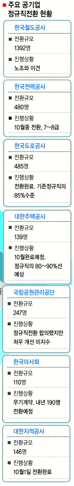 공기업 가운데 정규직 전환 대상자가 가장 많은 철도공사(코레일)는 지금까지 노사양측의 대립으로 전환 작업에 진척을 보지 못하고 있다. 철도공사는 비정규직 2600명 가운데 1차로 9월말까지 1392명을 정규직(무기계약직)으로 전환할 계획이었다. 이에 따라 공사는 비정규직보호법이 시행된 지난 7월1일부터 각종 수당을 소급 적용하고 임금도 정부 인상안에 맞춰 소급, 지급할 방침을 세워 놓고 있다. 또 비정규직 근로자 가운데 특정 자격을 갖춘 200명은 정규직으로 특별채용하는 절차도 진행중이다. 이에 필요한 예산은 영업수입 등을 활용해 250억원 정도를 확보해 놓고 있다. 하지만 노조측은 “특채는 소수를 위한 특혜에 불과하다.”고 반대하고 있다. 특히 노조는 비정규직 근로자 2600명 전원에 대해 정규직 전환을 요구하고 있다. 노조는 비정규직 전원을 정규직 6급으로 전환하고 각종 수당도 지난 1월부터 소급 적용되어야 한다는 주장을 굽히지 않고 있다.KTX 여승무원의 정규직화 문제도 변수가 될 전망이다.