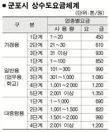 군포시 상수도요금의 경우(표 참조) 사용량이 1000t 이상일 때 가정용은 t당 450원, 대중탕용은 t당 690원이지만 일반용은 850원을 내야 한다.