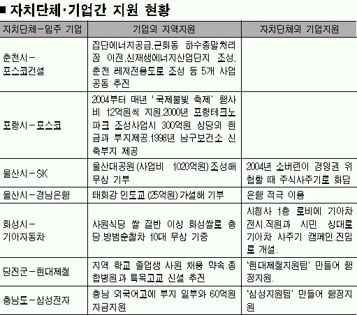 SK로부터 쉼터를 기부받은 울산 시민들은 2004년 회사가 다국적 헤지펀드 소버린에 경영권을 위협받자 “그냥 보고만 있을 수 없다.”며 대대적인 주식사주기 운동을 벌여 화답했다. 충남도는 삼성이 아산에 대규모 LCD단지를 만들기 시작하자 ‘삼성지원팀’을, 당진군은 지난 7월 ‘현대제철지원팀’을 만들어 갖가지 인허가와 민원을 해결해 주며 지역발전에 힘을 보태는 기업에 지원을 아끼지 않고 있다. 최영근 화성시장은 “자치단체에서 기업체 제품을 팔아주지만 기업체들도 지역농산물을 사주는 등 지역발전에 도움을 주면서 지역에 뿌리를 내리는 것을 크게 중시하고 있다.”고 말했다.