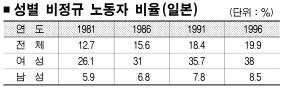-1996년 여성의 비정규 노동자 비율은 38%이고, 남성의 비정규 노동자 비율은 8,5%로 여성의 비율이 현저히 높으므로 외관상으로 상기의 지문은 틀린 것처럼 보인다.